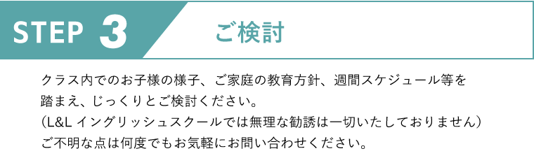 ご希望をお伺いし、適切なクラスの体験をご案内させていただきます。